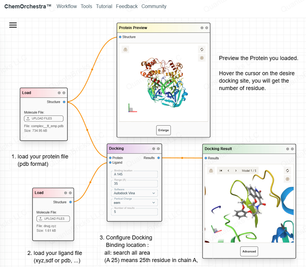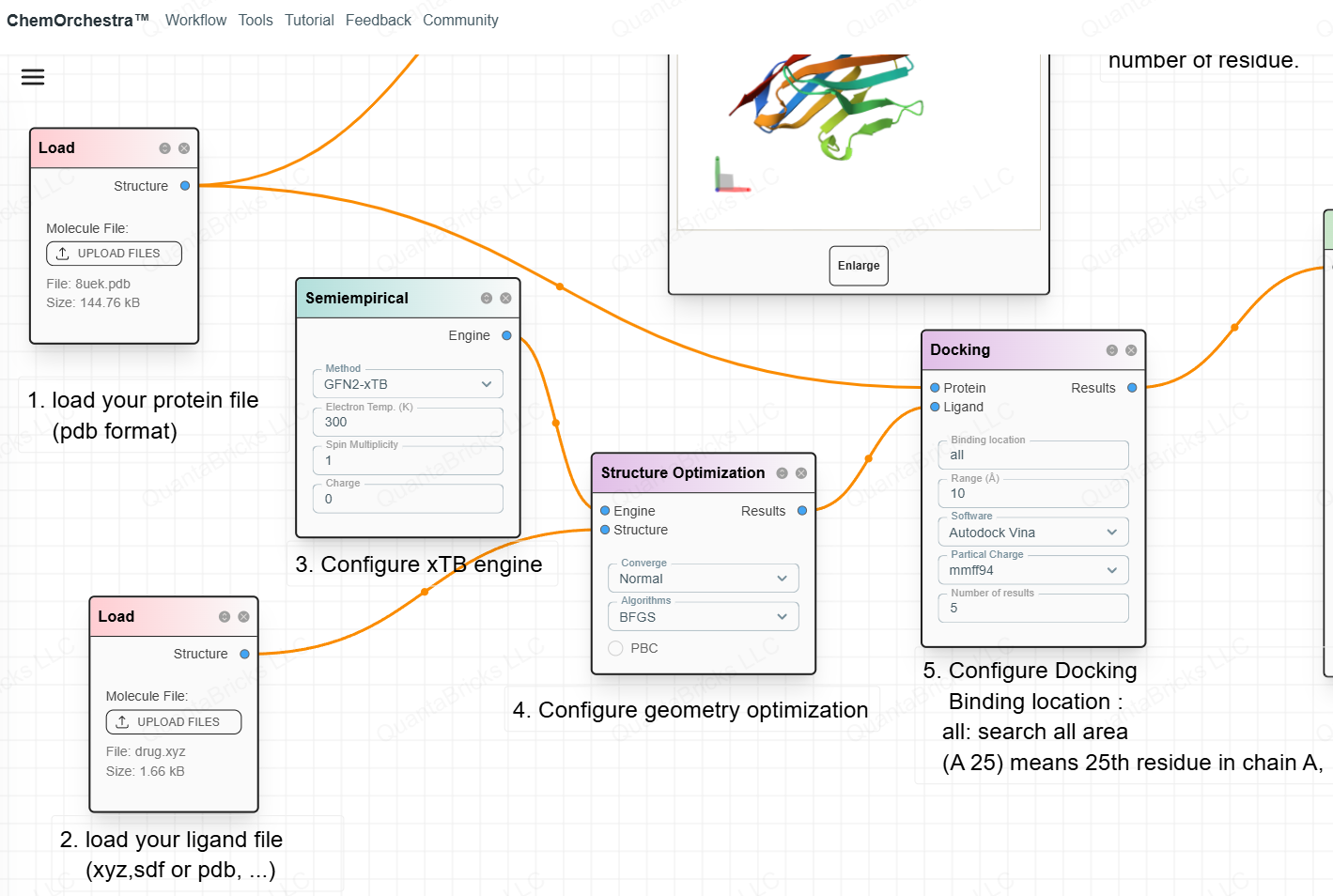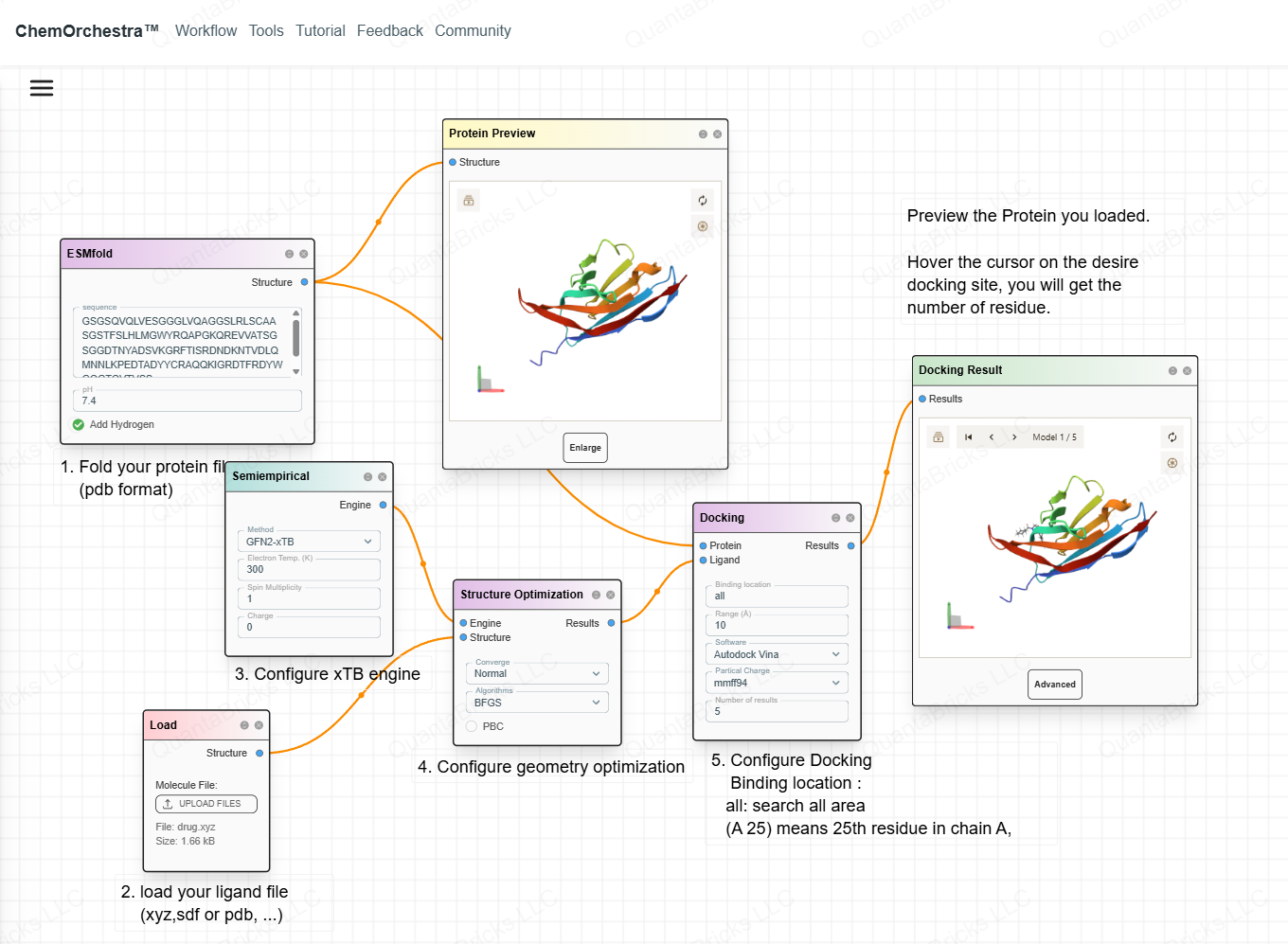 Let’s try a more complex workflow, you can fold the protein into the target receptor and add Hydrogen atoms to it. Then optimized the ligand structures. Finally do the docking. All of them can be composed in one workflow.
