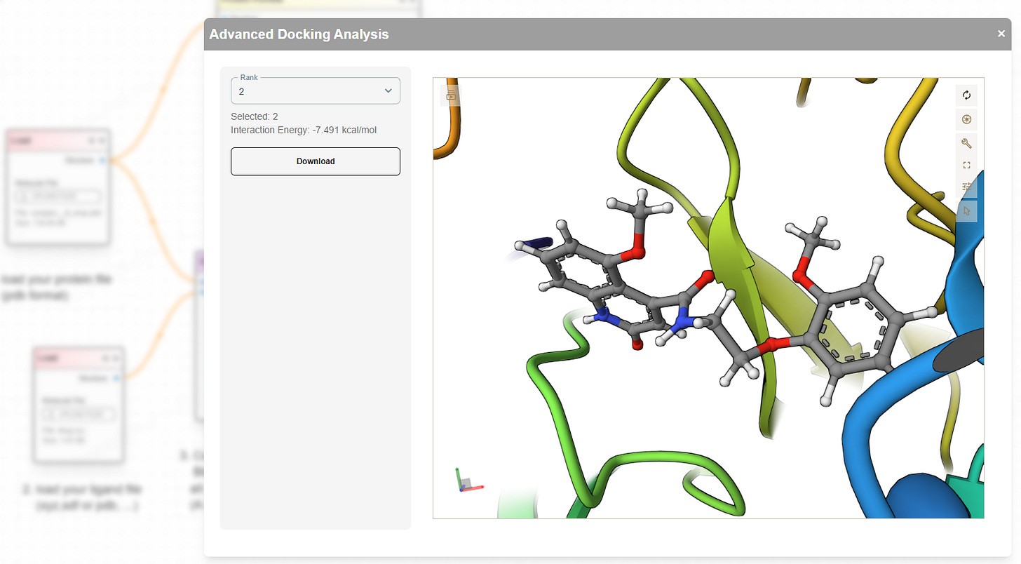 For making the molecular docking easier, especially for biologists without the training in computational chemistry, we provide an integrated platform with user-friendly UI for docking. The user only needs to upload their drugs and protein, and check their structure. Click some buttons, the tasks will be finished.